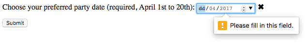 Se você tentar submeter o formulário com uma data imcompleta (ou com uma data fora da faixa), o navegador mostrará um erro. Tente executar o exemplo agora:
