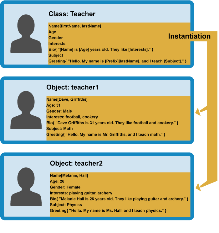 Quando uma instância de objeto é criada a partir de uma classe, a função construtora da classe é executada para criá-la. Esse processo de criação de uma instância de objeto de uma classe é chamado de instanciação — a instância do objeto é instanciada a partir da classe.